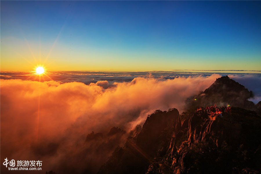中國(guó)網(wǎng)9月17日訊 9月17日,成百上千名游眾在黃山風(fēng)景區(qū)光明頂觀賞云海、日出和彩虹美景。當(dāng)天早上,在朝霞的映照下,云海中的白色云團(tuán)、云層和云浪都染上絢麗的色彩,像錦緞、像花海、像流脂,與奇松、怪石和秋色相映成輝,眼前的黃山猶如國(guó)畫大師李可染筆下的《黃山煙霞》圖。