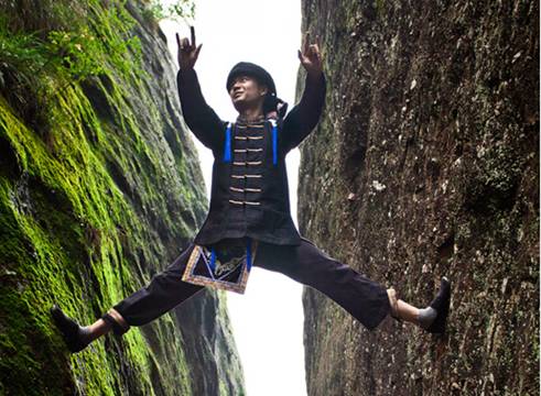 侗族小伙子在一線天,表演徒手攀巖的絕技。攝影:多布