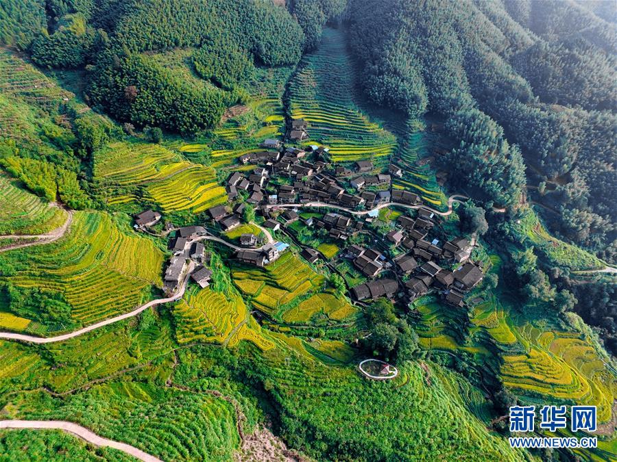 金秋時節(jié),福建武夷山秋意盎然,金黃色的稻谷隨風舞動,一派豐收景象。