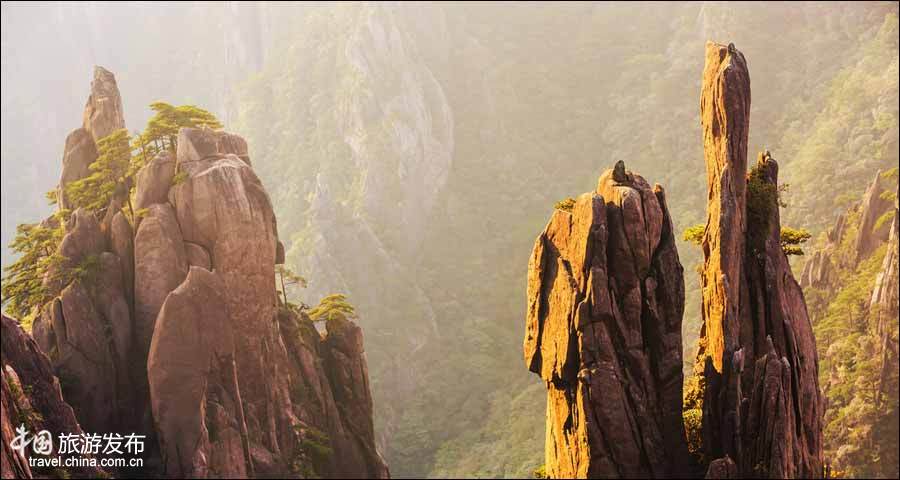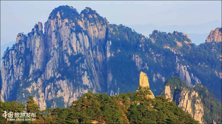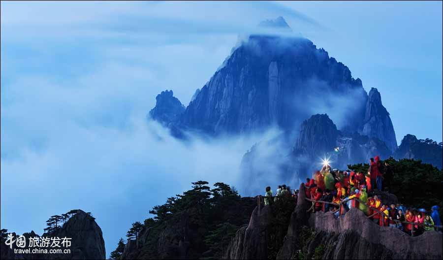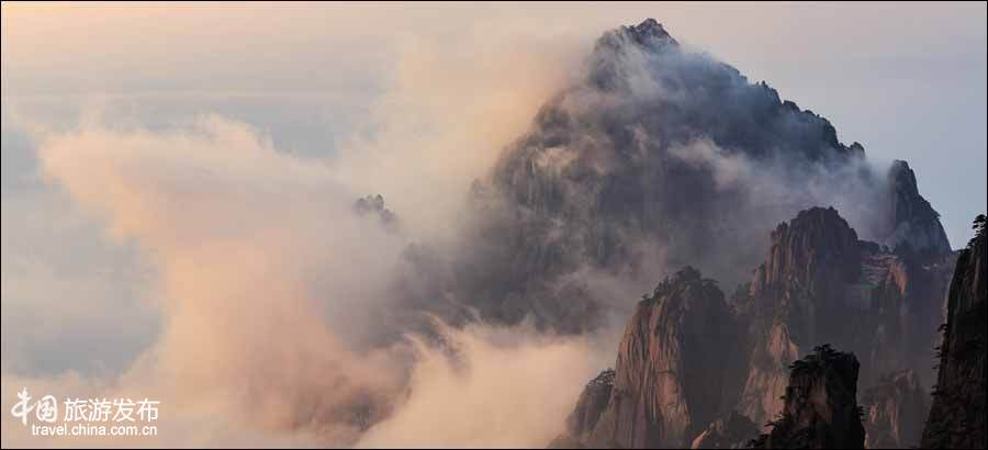 峰石在云海烘托下,把黃山幻化成亦真亦幻人間仙境。讓人不由想起明代馮夢幀《初霽登煉丹峰》詩句:“聳身到峰頂,下界煙蒙蒙。環(huán)坐松石間,翠色澄心胸。霧消山遞呈,青紫殫妍容。安得乘日車,踏遍高低峰!