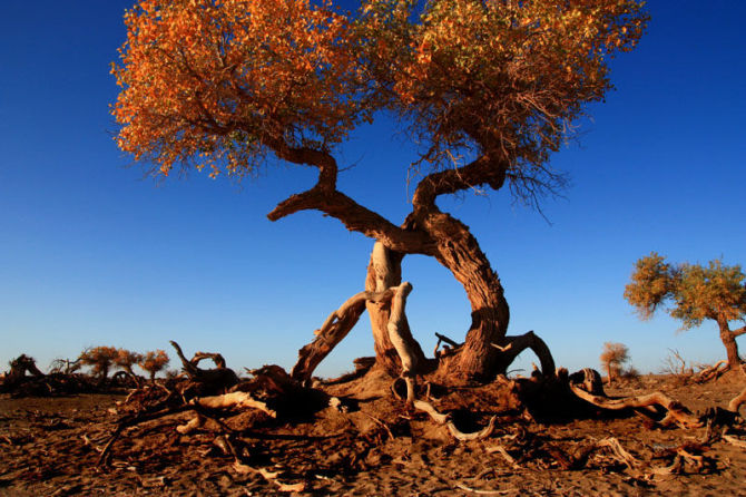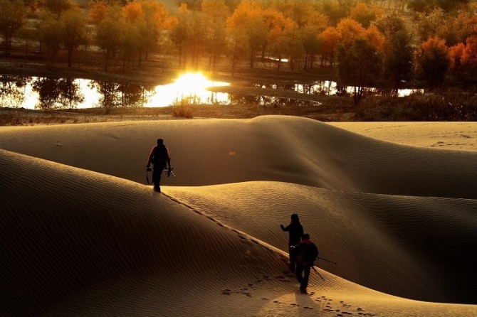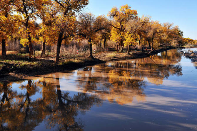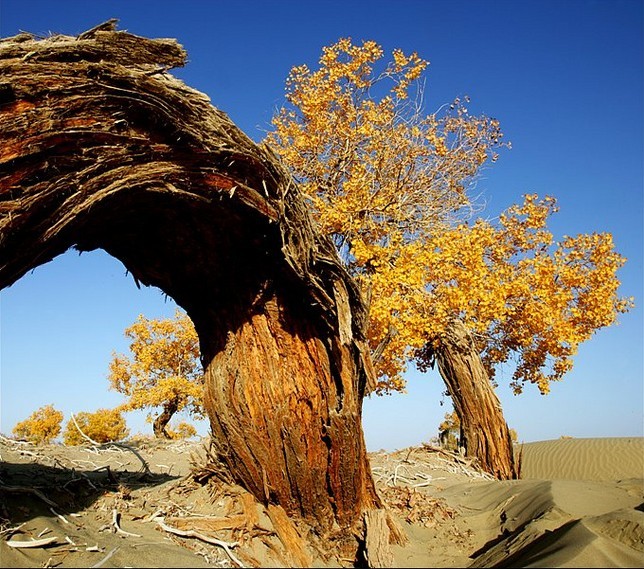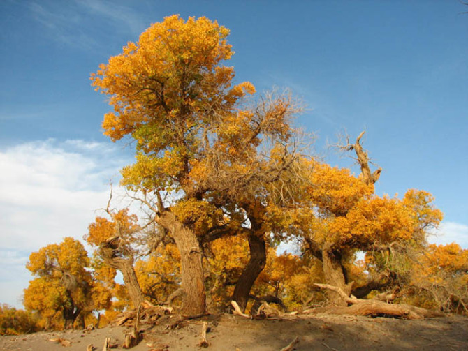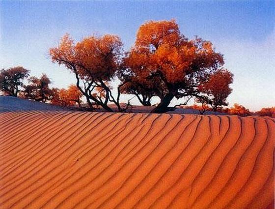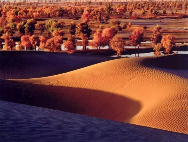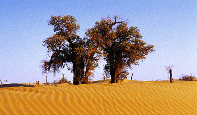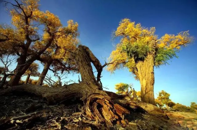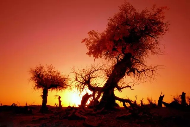 胡楊林是塔里木河流域典型的荒漠森林草甸植被類型,從上游河谷到下游河床均有分布。雖然胡楊林結(jié)構(gòu)相對簡單,但具有很強的地帶性生態(tài)烙印。無論是朝霞映染,還是身披夕陽,它在給人以神秘感的同時,也讓人解讀到生機與希望。據(jù)有關(guān)資料顯示,人們還夸贊胡楊巨大的生命力是“三個一千年”,即活著一千年不死,死后一千年不倒,倒后一千年不朽。