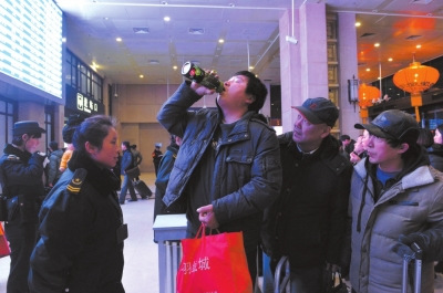 北京站進站安檢大廳內(nèi),安檢員要求持液體進站的旅客開蓋試喝。