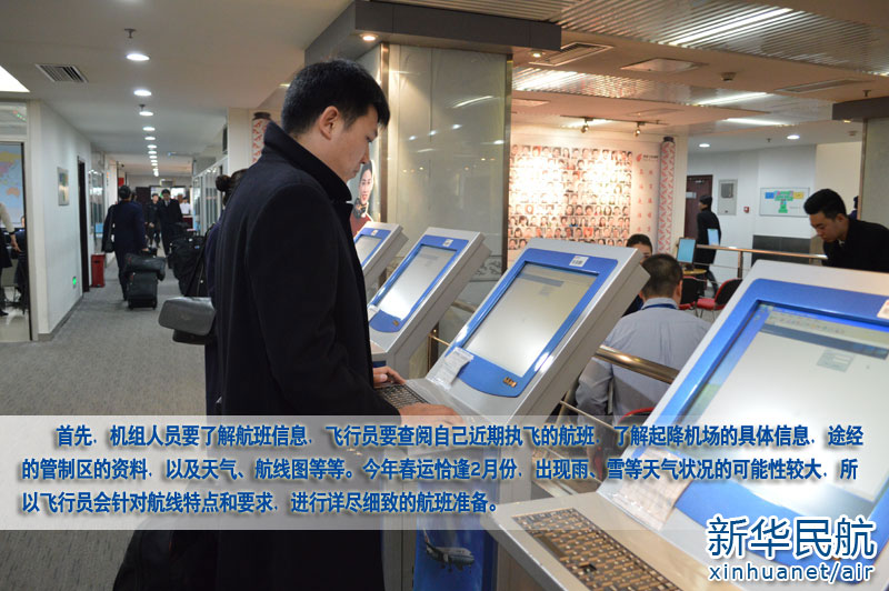 機(jī)組人員正在自助機(jī)上查詢航班信息