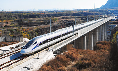 11月18日,我國具有完全自主知識(shí)產(chǎn)權(quán)的時(shí)速350公里中國標(biāo)準(zhǔn)動(dòng)車組,在大西(大同至西安)客運(yùn)專線跑出385公里/小時(shí)的試驗(yàn)速度,列車各項(xiàng)技術(shù)性能表現(xiàn)優(yōu)異,通過了高速試驗(yàn)“大考”。圖為中國標(biāo)準(zhǔn)動(dòng)車組在大西客運(yùn)專線進(jìn)行高速試驗(yàn)。