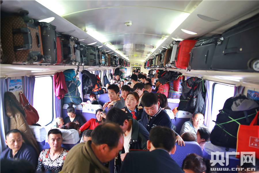 2016年3月1日廣州,廣州至烏魯木齊南的T135次列車3號(hào)硬座車廂滿載旅客,過(guò)道上站滿旅客,目測(cè)此車廂超員率超過(guò)50%。列車乘務(wù)員程春梅在車廂內(nèi)檢查行李擺放情況。(張永恒攝)