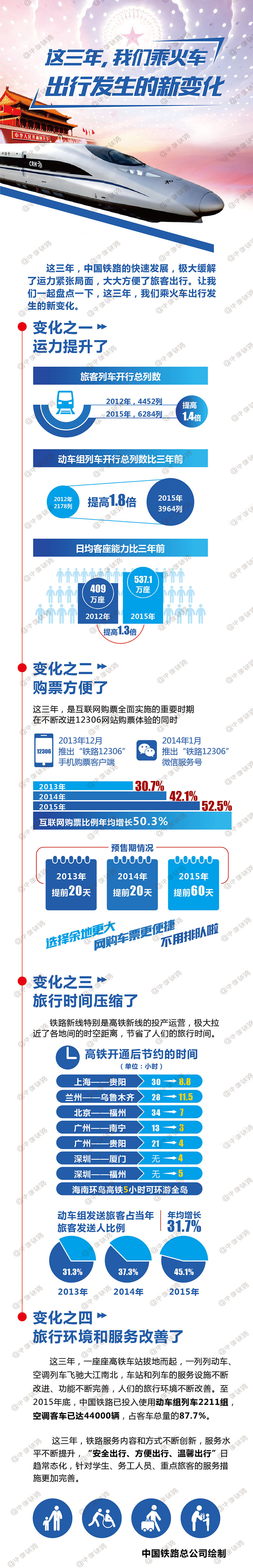 這三年,一座座高鐵車站拔地而起,一列列動車、空調(diào)列車飛馳大江南北,車站和列車的服務(wù)設(shè)施不斷改進、功能不斷完善,人們的旅行環(huán)境不斷改善。至2015年底,中國鐵路已投入使用動車組列車2211組,空調(diào)客車已達44000輛,占客車總量的87.7%。