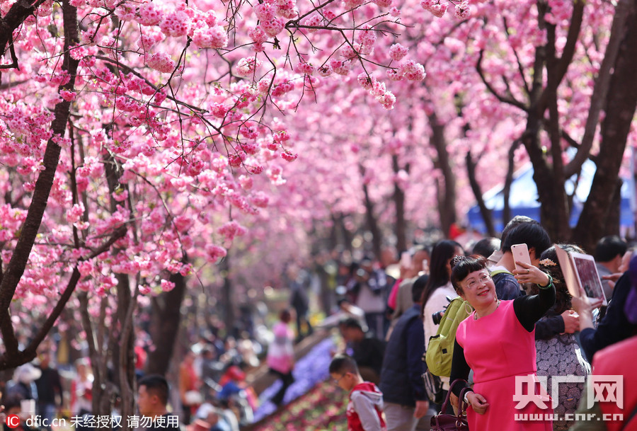 2016年3月13日,云南昆明,昆明圓通動物園,樹千株櫻花和海棠進入盛花期,整個公園成了花海,“圓通櫻潮”的盛況讓游人流連忘返,陶醉其中。