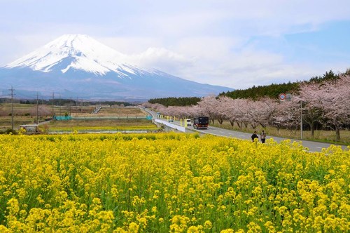 日本富士山下油菜花悉數(shù)綻放 與櫻花交相輝映