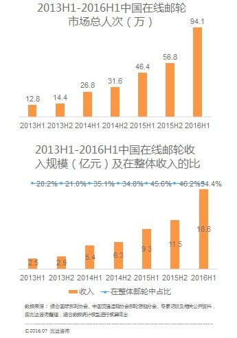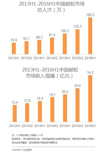 數(shù)據(jù)顯示,2016上半年中國在線郵輪市場總出游人次達(dá)94.1萬,同比增長102.8%,總收入(交易額)18.6億元,同比增長100%,占整個郵輪市場的54.4%,比去年同期提高了8個百分點。
