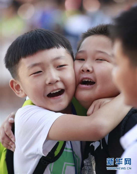 9月1日,河南省湯陰縣第一實(shí)驗(yàn)小學(xué)三年級(jí)學(xué)生田佳民(左)和張辰瑜擁抱在一起。新學(xué)期,每個(gè)學(xué)生感受都不同,有初來乍到的新奇,有早起上課的困倦,有與小伙伴重逢的喜悅,也有與家人短暫離別的不舍……開學(xué)的表情,豐富多彩。新華社發(fā)(常中正攝)
