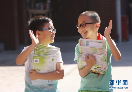 8月31日,在江蘇省無錫市揚(yáng)名中心小學(xué),兩名同學(xué)在領(lǐng)取新學(xué)期教材。新學(xué)期,每個(gè)學(xué)生感受都不同,有初來乍到的新奇,有早起上課的困倦,有與小伙伴重逢的喜悅,也有與家人短暫離別的不舍……開學(xué)的表情,豐富多彩。新華社發(fā)(湯毅攝)