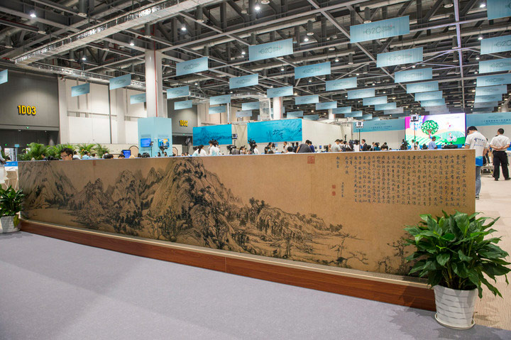 新聞中心檔板上的《富春山居圖》被譽(yù)為“中國十大傳世名畫”之一,是元代畫家黃公望的代表作,以浙江富春江為背景,全圖用墨淡雅,山和水的布置疏密得當(dāng),墨色濃淡干濕并用,極富于變化。明朝末年傳到收藏家吳洪裕手中,吳洪裕極為喜愛此畫,甚至在臨死前下令將此畫焚燒殉葬,被吳洪裕的侄子從火中搶救出,但此時(shí)畫已被燒成一大一小兩段。較長的后段稱《無用師卷》,現(xiàn)藏臺(tái)北故宮博物院;前段稱《剩山圖》,現(xiàn)收藏于浙江省博物館。
