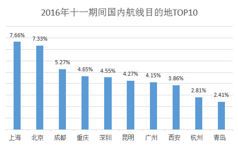 十一期間,哪兒的人出行指數(shù)最高?作為首都的北京當(dāng)仁不讓,上海緊隨其后。北、上、廣、深這四個(gè)超一線城市的出游人數(shù)均位列前十名。喜歡安逸的成都人同樣也是十一出游的愛(ài)好者,以5.1%的占比排名第三位。專家分析,隨著二線城市居民GDP的提升,收入的增加、機(jī)票價(jià)格的下降,越來(lái)越多二線城市加入到乘機(jī)出游的大軍里來(lái)。
