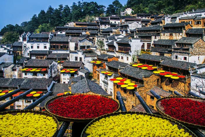 在九月收獲之后,當(dāng)?shù)囟剂餍邪咽斋@的果實放在自家屋脊上裸曬。此景與古徽州的黑白建筑,田園風(fēng)光相映成趣,獨特魅力而又壯觀。