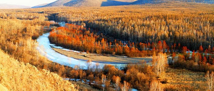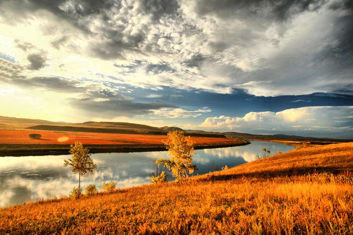 秋天的呼倫貝爾,你不但能體驗到牧民收獲的喜悅與快樂,也能體驗藍(lán)天白云、金色草原、潔白的蒙古包、牛羊相映成趣。林海中,紅的像火、黃的像金、白樺如銀、萬峰浸染。這里遠(yuǎn)離城市的喧囂,長吸一口空氣——清新,大喝一口山泉——甘甜;蒼山林海,白云碧空渾然一體,隨你什么都可以想,隨你什么都可以不想,盡洗人間煩躁。