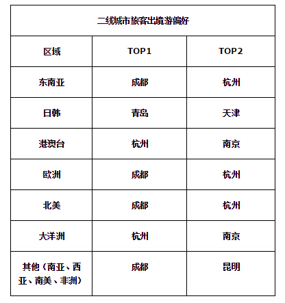 另一個(gè)有意思的現(xiàn)象是,二線城市旅客,對(duì)于出境游目的地的偏好各不相同。大體來(lái)說(shuō),杭州、南京旅客愛(ài)去港澳臺(tái)和大洋洲,成都旅客愛(ài)去歐美,青島與天津旅客偏愛(ài)日韓,昆明則是飛往南亞的主要客源地。