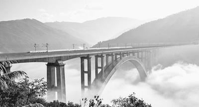 28日,一列動(dòng)車組正在穿越云霧繚繞的南盤(pán)江特大橋。