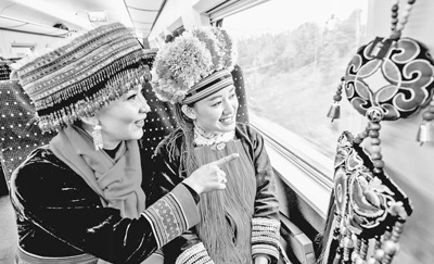 28日,身著民族服裝的姑娘在體驗(yàn)滬昆高鐵。