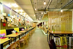 言幾又,看名字就知道,“言幾又”,合起來(lái)就是設(shè)計(jì)的“設(shè)”,這里玩兒的就是設(shè)計(jì)。不僅賣咖啡、簡(jiǎn)餐,還賣書和創(chuàng)意商品。其實(shí)嚴(yán)格來(lái)說(shuō),這里并不是一家餐廳,而是一家創(chuàng)意書店。就餐區(qū)內(nèi)一個(gè)一條十多米長(zhǎng)的“書墻”,也是這里的主要特色,讓文藝青年們?cè)诰筒偷耐瑫r(shí)也能感受到富有鮮活生活方式的文學(xué)氣息。餐區(qū)內(nèi)通過(guò)使用簡(jiǎn)單的材料組合,如木頭、磚頭以及混凝土地板平臺(tái)營(yíng)造出令人放松的環(huán)境氛圍,傳遞出一種現(xiàn)代的簡(jiǎn)潔新潮風(fēng)格。