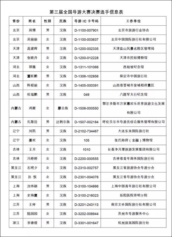根據(jù)國家旅游局發(fā)布的《國家旅游局辦公室關于印發(fā)<第三屆全國導游大賽決賽實施方案>的通知》的安排,經(jīng)各省、自治區(qū)、直轄市旅游發(fā)展委員會、旅游局,新疆生產(chǎn)建設兵團旅游局的選拔和推薦,共有63名選手參加第三屆全國導游大賽決賽。