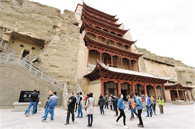 自2016年首屆絲綢之路(敦煌)國際文化博覽會在甘肅敦煌成功舉辦以來,敦煌受到越來越多的關注。敦煌借此機遇,推出多項旅游優(yōu)惠政策。據(jù)統(tǒng)計,僅今年第一季度,敦煌市旅游接待量就達113萬人次,總收入達11億元,分別增長20%和21.5%。上圖為游客在敦煌莫高窟參觀九層樓。