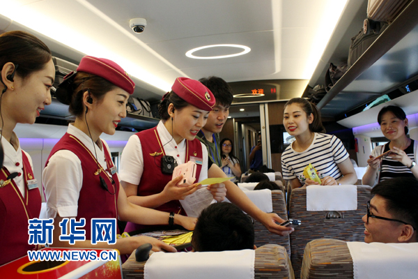 為慶!皬团d號”列車首發(fā),G123列車長帶領團隊在車內舉辦有獎竟猜活動,旅客積極參與。 新華網 郭香玉 攝