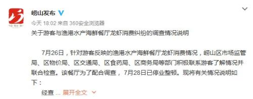 7月26日,針對游客反映的漁港水產(chǎn)海鮮餐廳龍蝦消費情況,嶗山區(qū)市場監(jiān)管局、區(qū)物價局、區(qū)交通局、區(qū)食藥局、區(qū)商務(wù)局等部門積極聯(lián)系游客了解情況并聯(lián)合檢查。該餐廳為了配合調(diào)查,7月28日已停業(yè)整頓。有關(guān)情況說明如下: