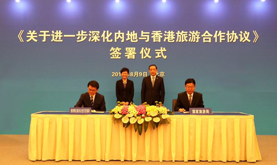 會(huì)見后,在李金早和林鄭月娥共同見證下,國家旅游局與香港特區(qū)商務(wù)及經(jīng)濟(jì)發(fā)展局在京簽署《關(guān)于進(jìn)一步深化內(nèi)地與香港旅游合作協(xié)議》。