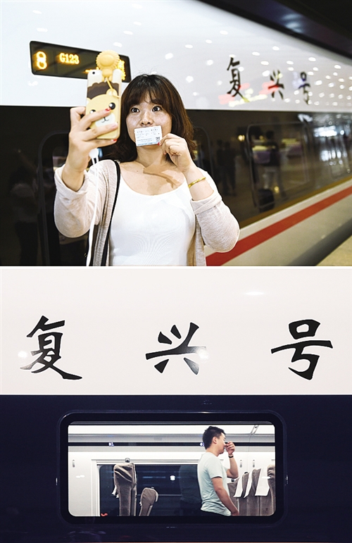 上圖:一位乘坐“復(fù)興號”G123次列車的乘客在北京南站車外與列車合影。新華社記者 鞠煥宗攝 下圖:乘客在上海虹橋火車站“復(fù)興號”G124次列車內(nèi)行走。新華社記者 丁 汀攝