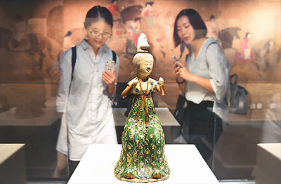 杭州舉行“一日看盡長(zhǎng)安花——唐都長(zhǎng)安三彩精華展”。圖為觀眾在欣賞“三彩釉陶梳妝女坐俑”。