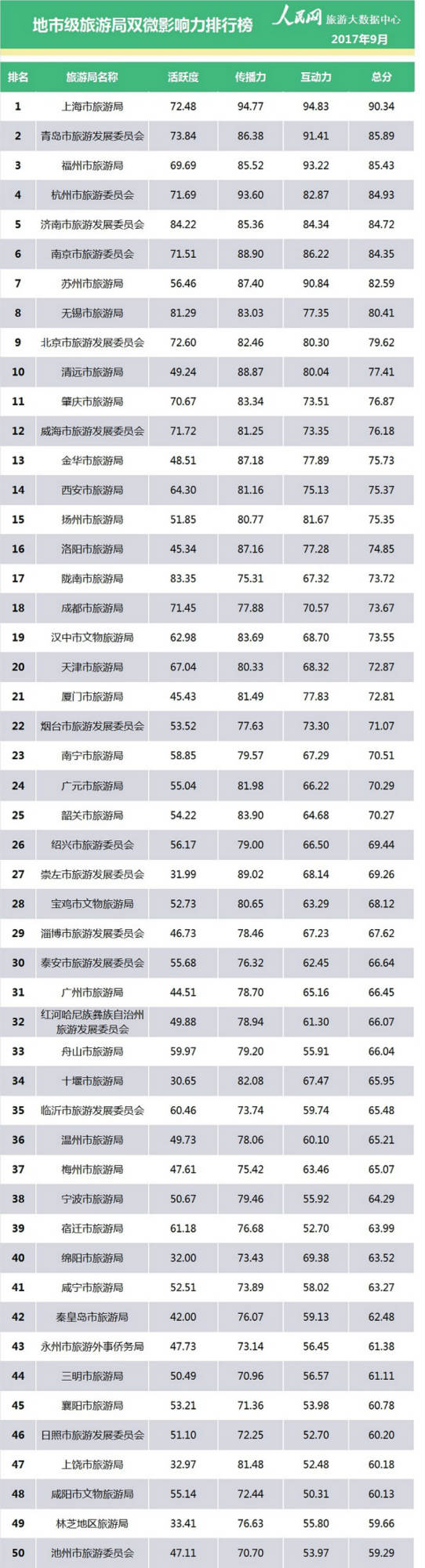 人民網(wǎng)輿情監(jiān)測室發(fā)布2017年9月全國地市級旅游局雙微影響力排行榜,榜單以全國范圍內(nèi)的地市級旅游局官方認(rèn)證微博、微信為評價對象,綜合考察活躍度、傳播力和互動力三個指標(biāo),通過海量數(shù)據(jù)分析和復(fù)雜的數(shù)理模型計算,全面、立體、準(zhǔn)確地反映旅游系統(tǒng)新媒體的發(fā)展?fàn)顩r。