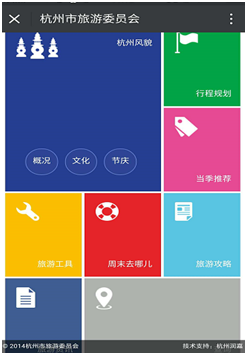 杭州旅游發(fā)展委員會微信公眾號“杭州旅游發(fā)布”設(shè)置“微門戶”融合各種便民旅游信息,例如“杭州風(fēng)貌”、“行程規(guī)劃”、“當(dāng)季推薦”、“旅游工具”、“周末去哪兒”等模塊,為用戶提供了一站式服務(wù)信息,為用戶帶來極大便利獲得好評不斷。(禾。