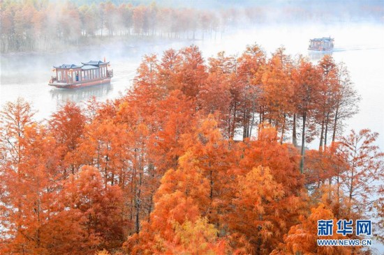 11月28日,游人乘船在江蘇省盱眙縣“水上森林”景區(qū)內(nèi)游覽。進(jìn)入冬季,位于江蘇中部的淮安市盱眙縣天泉湖“水上森林”景區(qū)色彩斑斕,在景區(qū)游覽,游人可體驗(yàn)“人在畫中游”的美感。 新華社發(fā)(周海軍攝)