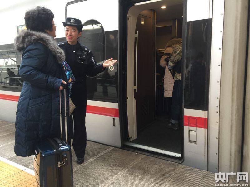 央廣網(wǎng)北京1月23日消息 “你好,受累看一下我是坐這趟車嗎?”“阿姨您好,您的車票上是G1次列車,小心站臺(tái)與列車的空隙,慢點(diǎn)上車……”2018年1月22日上午8時(shí)45分,由天津鐵路公安處乘警支隊(duì)擔(dān)當(dāng)值乘的G1次列車上,即將迎來乘警生涯春運(yùn)首秀的劉曉燕,有條不紊的組織旅客乘降,迎接旅客上車。