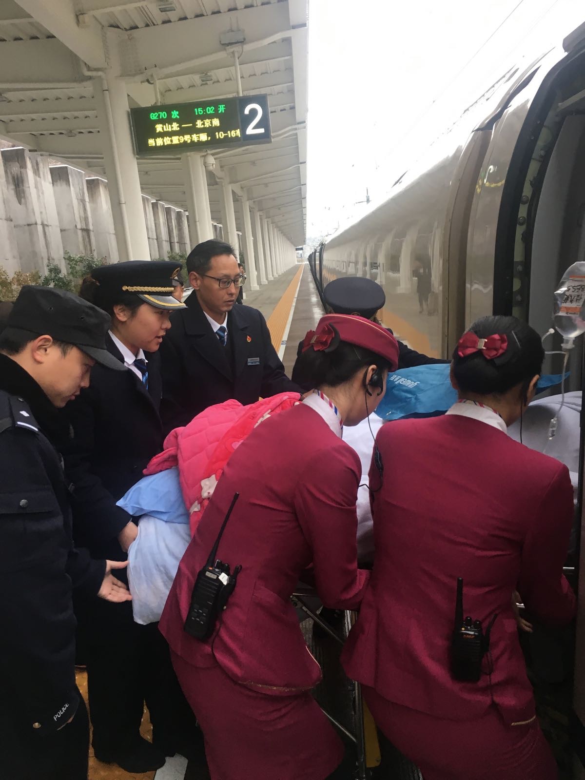 2018年1月27日 合福高鐵旌德站,在醫(yī)護(hù)人員的指導(dǎo)下,醫(yī)護(hù)人員、鐵路職工及家屬,通過肩扛手抬將病人送上G270次列車。(圖片由上海局提供)