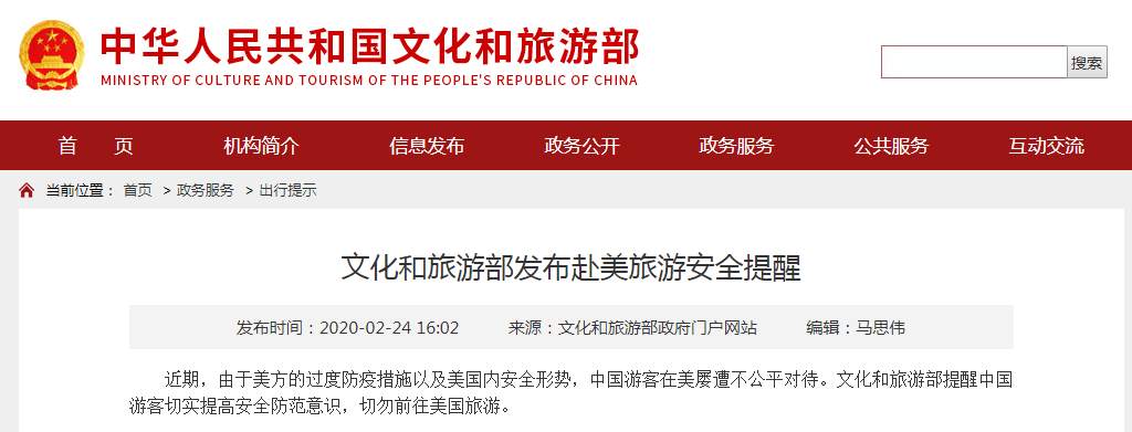 2月24日,文旅部網(wǎng)站發(fā)布赴美旅游安全提醒,稱近期由于美方的過度防疫措施以及美國內(nèi)安全形勢,中國游客在美屢遭不公平對待。文化和旅游部提醒中國游客切實提高安全防范意識,切勿前往美國旅游。
