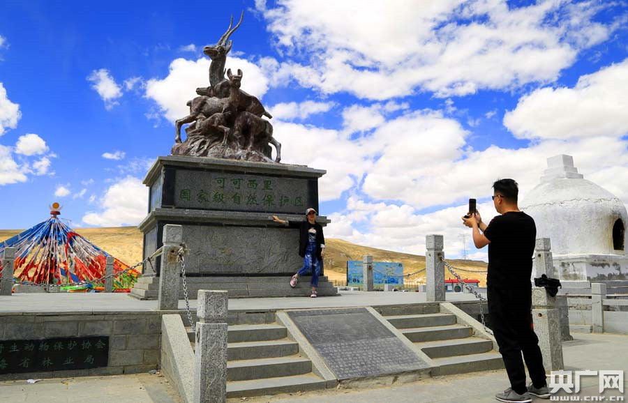 游客在昆侖山口的可可西里自然保護(hù)區(qū)藏羚羊雕塑前留影(央廣網(wǎng)記者 張雷 攝)