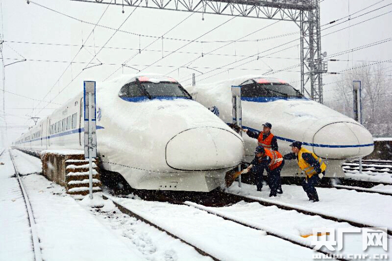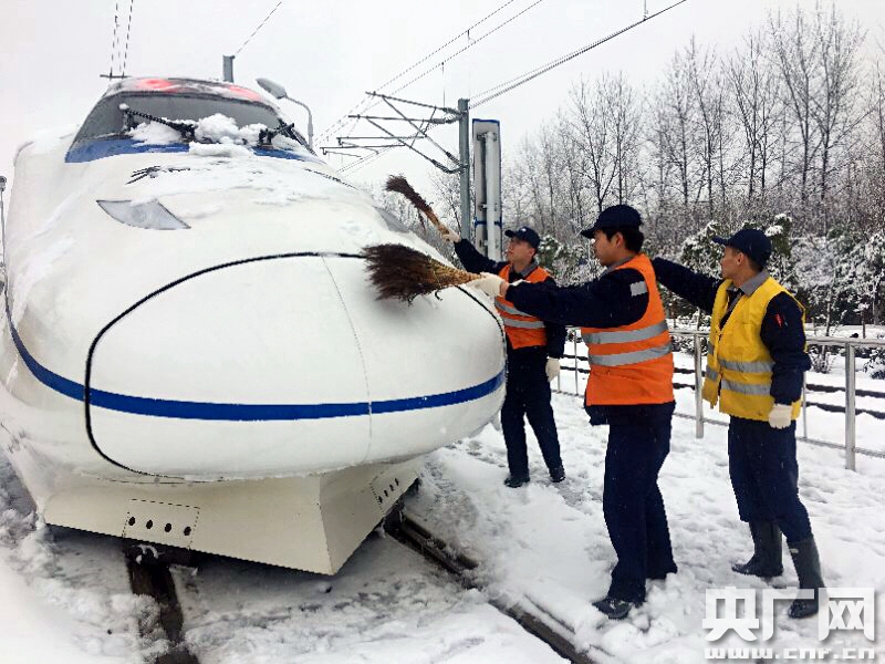 2018年1月4日,合肥南動(dòng)車運(yùn)用所內(nèi),職工正在為即將上線運(yùn)行的動(dòng)車組進(jìn)行掃雪除冰。(央廣網(wǎng)發(fā) 謝冰飛攝) 央廣網(wǎng)北京1月5日消息(記者何微)4日,由于大范圍、高強(qiáng)度的降雪,不少地區(qū)的鐵路運(yùn)輸受到不同程度影響。多地列車出現(xiàn)延誤和停運(yùn)情況,京廣、鄭徐、鄭西、西成等部分線路采取限速運(yùn)行措施。影響范圍覆蓋湖北、河南、安徽、江蘇、陜西、四川等地。有計(jì)劃乘火車去往或途經(jīng)上述地區(qū)的乘客請密切注意鐵路部門的信息公告。鐵路部門已經(jīng)啟動(dòng)應(yīng)急預(yù)案,組織數(shù)萬名鐵路干部職工掃冰除雪,努力確保旅客出行安全暢通。 -