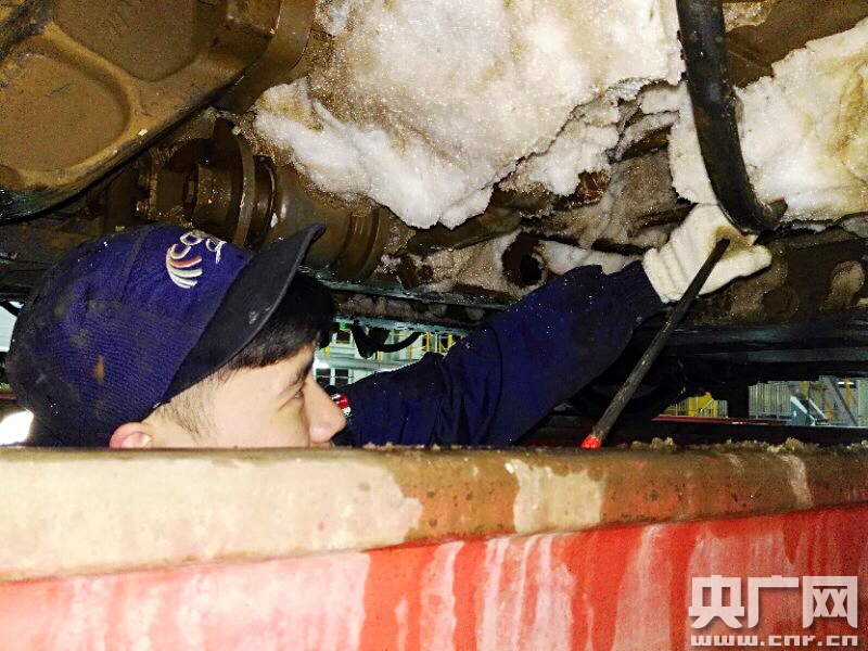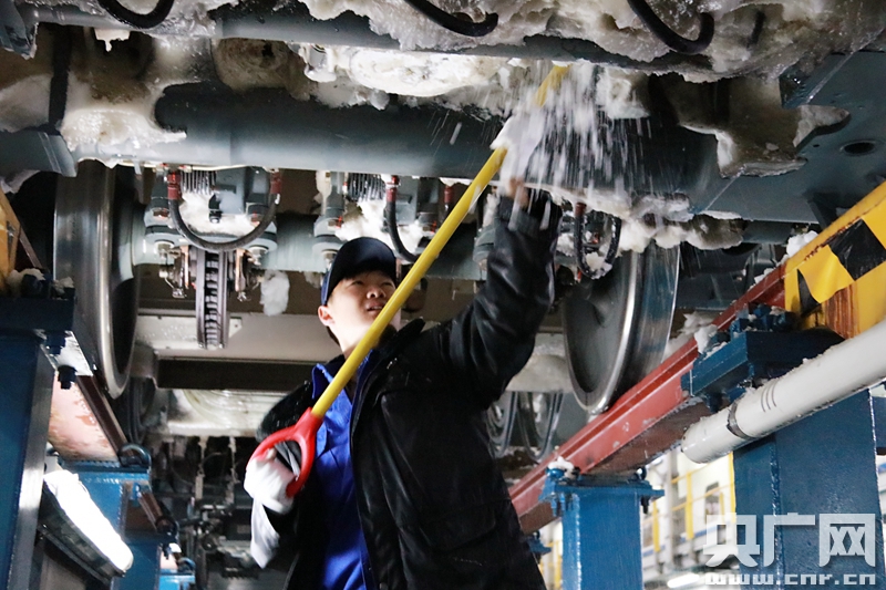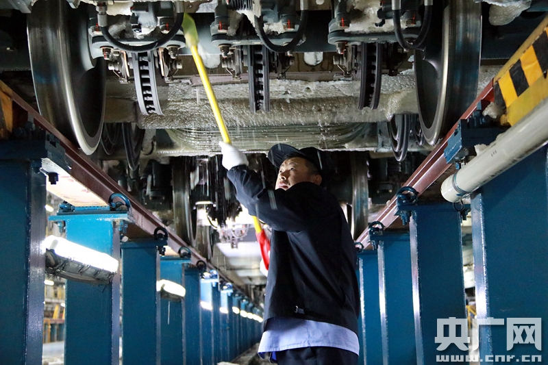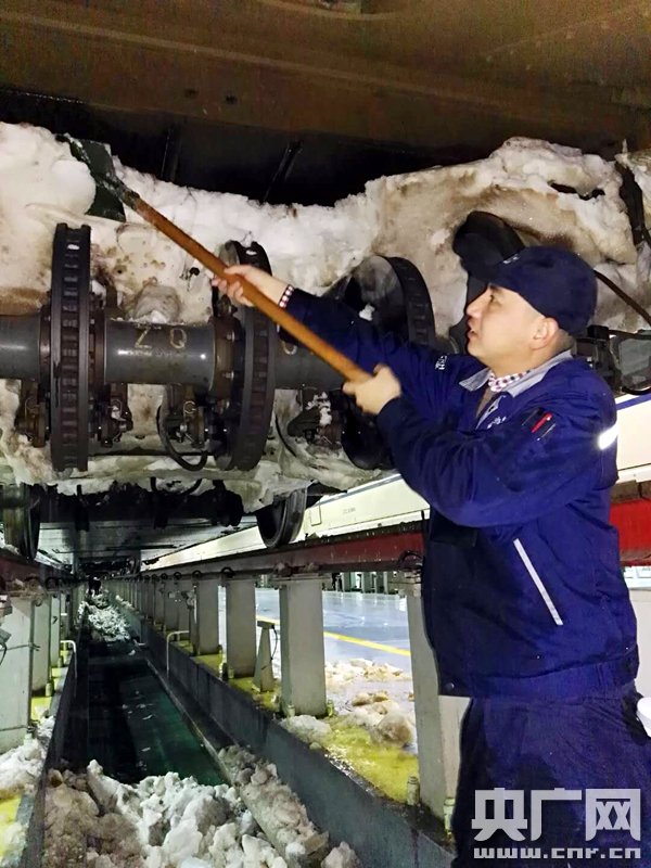 2018年1月4日 中國鐵路北京局集團(tuán)公司北京動(dòng)車段,職工正在進(jìn)行動(dòng)車組列車底部的掃雪除冰作用。(央廣網(wǎng)發(fā) 高悅攝)