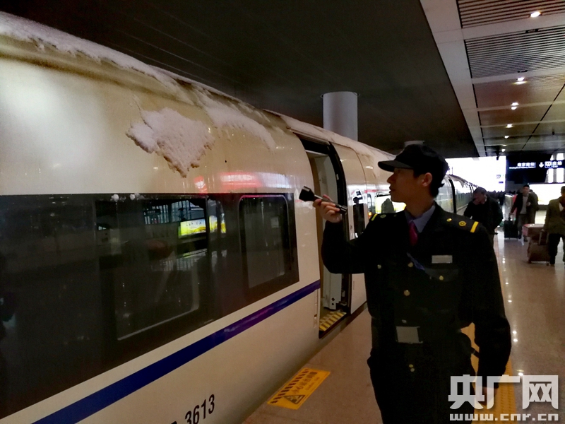 2018年1月4日,中國鐵路上海局集團(tuán)公司南京動(dòng)車段隨車機(jī)械師對動(dòng)車組列車加強(qiáng)站臺檢查,確保雨雪天氣中動(dòng)車組安全運(yùn)行。(央廣網(wǎng)發(fā) 謝冰飛攝) -