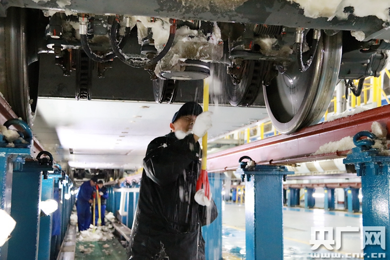 2018年1月4日 中國鐵路北京局集團(tuán)公司北京動(dòng)車段,職工正在進(jìn)行動(dòng)車組列車底部的掃雪除冰作用。(央廣網(wǎng)發(fā) 高悅攝) -