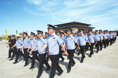 9月2日下午,酒泉市舉行了全市公安機(jī)關(guān)安保誓師大會(huì)。圖為公安干警邁著整齊的步伐走過(guò)敦煌國(guó)際會(huì)展中心廣場(chǎng)。通訊員鄒凱強(qiáng)
