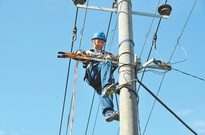為做好第二屆敦煌文博會(huì)期間的電力保障,國(guó)網(wǎng)甘肅電力公司和嘉峪關(guān)、酒泉供電公司及酒泉7縣市區(qū)骨干力量,深入開(kāi)展護(hù)網(wǎng)專項(xiàng)行動(dòng)。圖為9月6日,敦煌市月牙泉鎮(zhèn)合水村,國(guó)網(wǎng)肅北供電公司的檢修員寧生海正在十幾米高的電線桿頂部掛接地線。通訊員楊夏茹