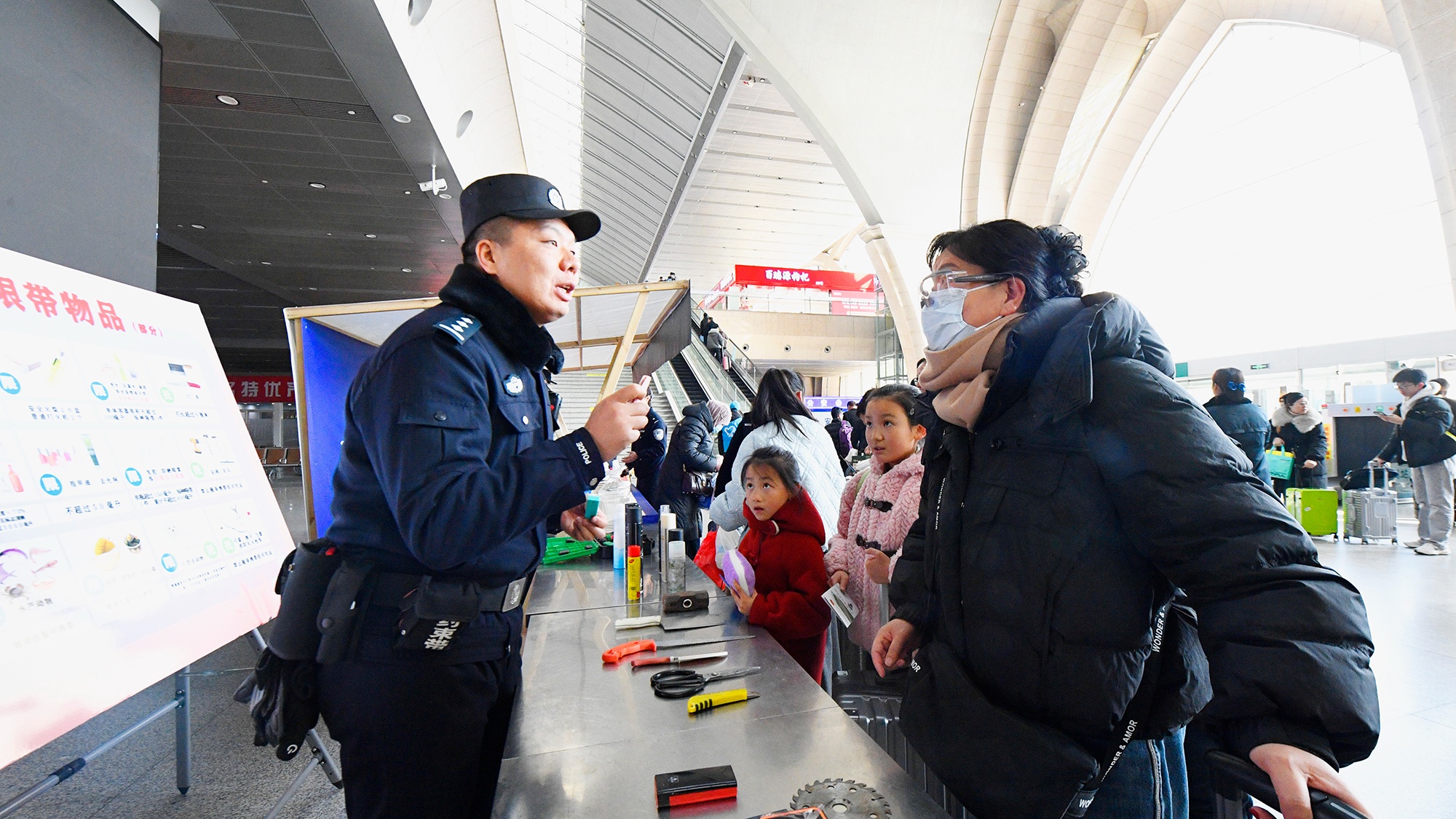民警向旅客宣傳攜帶違禁品帶來(lái)的嚴(yán)重危害。(央廣網(wǎng)發(fā) 通訊員供圖)