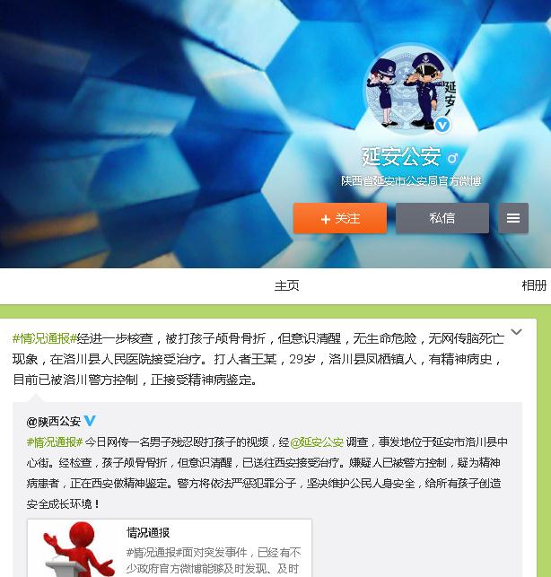 14時(shí),陜西省延安市公安局官方微博@延安公安發(fā)布消息稱(chēng),經(jīng)進(jìn)一步核查,被打孩子顱骨骨折,但意識(shí)清醒,無(wú)生命危險(xiǎn),無(wú)網(wǎng)傳腦死亡現(xiàn)象,在洛川縣人民醫(yī)院接受治療。打人者王某,29歲,洛川縣鳳棲鎮(zhèn)人,有精神病史,目前已被洛川警方控制,正接受精神病鑒定。