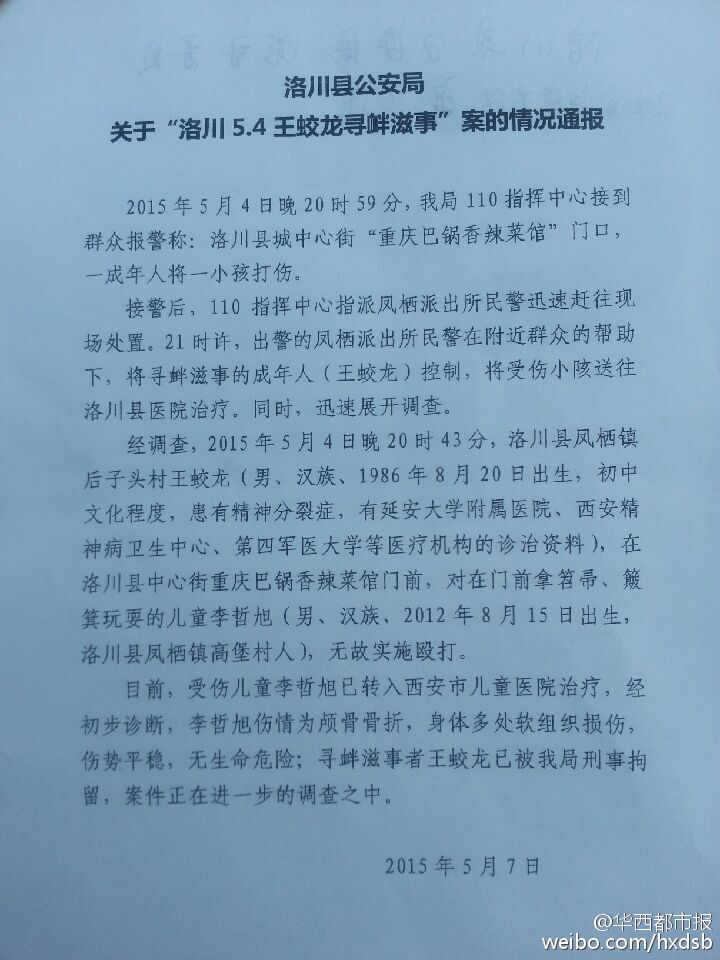 經(jīng)調(diào)查,2015年5月4日晚20時(shí)43分,洛川縣鳳棲鎮(zhèn)后子頭村王蛟龍(男、漢族、1986年8月20日出生,初中文化程度,患有精神分裂癥,有延安大學(xué)附屬醫(yī)院、西安精神病衛(wèi)生中心、第四軍醫(yī)大學(xué)等醫(yī)療機(jī)構(gòu)的診治資料),在洛川縣中心街重慶巴鍋香辣菜館門(mén)前,對(duì)在門(mén)前拿笤帚、簸箕玩耍的兒童李哲旭(男、漢族、2012年8月15日出生,洛川縣鳳棲鎮(zhèn)高堡村人),無(wú)故實(shí)施毆打。
