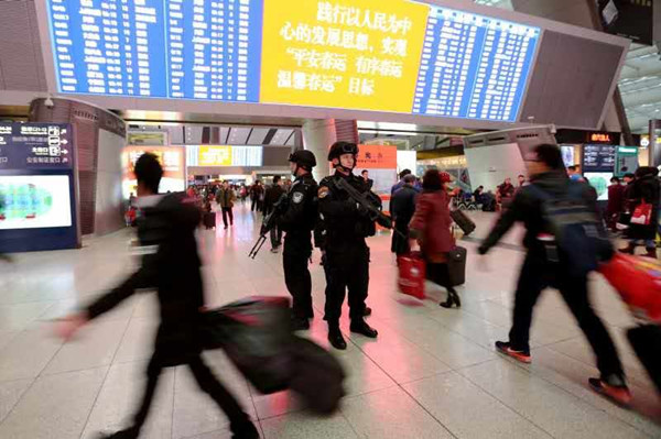 據(jù)悉,春節(jié)期間北京各大火車站的客流主要以中短途走親訪友為主。節(jié)日期間,北京鐵路警方在北京站、北京西站、北京南站等客流集中的火車站安排執(zhí)勤民警、特警值守,同時(shí)還安排巡邏民警加強(qiáng)對(duì)廣場(chǎng)、售票廳、候車室和站臺(tái)等區(qū)域的巡邏檢查,全面清除各類不安全隱患。此外,在京滬、京哈、京廣、京九、京原、京包、京通等進(jìn)京鐵路沿線、高鐵沿線和主要車站安排民警盯守、巡邏,全面確保節(jié)日期間北京各大火車站和鐵路沿線的安全。