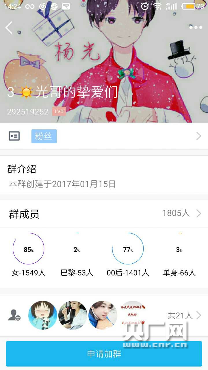 記者轉變方式,想要加入粉絲群側面了解情況,但直至截稿前也未得到同意進入該群。記者通過查看群資料發(fā)現(xiàn),這個粉絲群共1805名成員,其中女性占85%,共1549人,“00后”占77%,共記1401人。