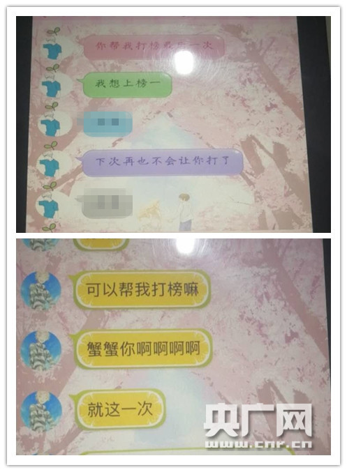 通過孫女士給記者發(fā)來聊天記錄截圖可以看出來,很多主播都在跟小蘇有意拉近關系,并在言語中直接或間接地向她提起給自己“打榜”或“想上榜”。還有的主播甚至對小蘇承諾“就這一次”、“下次再也不會讓你打了”。