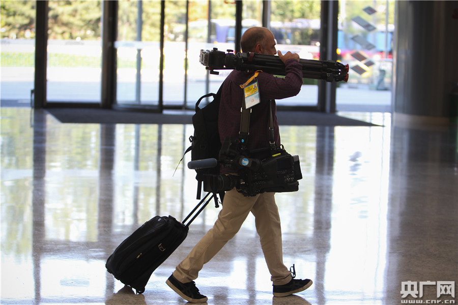 在“一帶一路”國(guó)際合作高峰論壇新聞中心內(nèi),一位記者離開(kāi)會(huì)場(chǎng)。(央廣網(wǎng)記者 王永康 攝) -